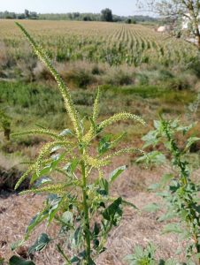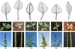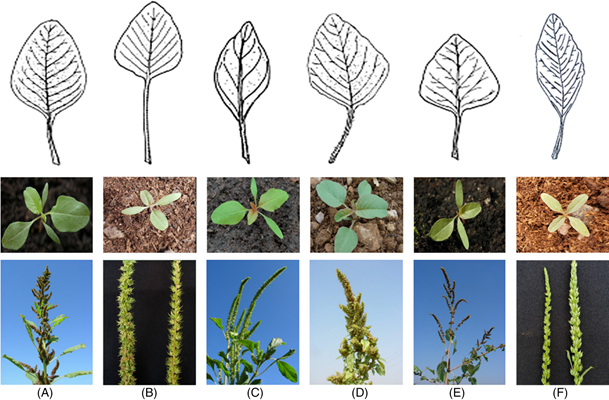 Figura. Especies de Amaranthus que se pueden confundir con Amaranthus palmeri en el región Mediterránea enm plántula  (arriba) y en floración (debajo). De izquierda a derecha, Amaranthus hybridus (A), Amaranthus palmeri (B), Amaranthus powellii (C), Amaranthus retroflexus (D), Amaranthus viridis (E) and Amaranthus tuberculatus (F). Para las especies dioicas (A. palmeri y A. tuberculatus), se muetra la inflorescencia masculina a la derecha y la femenina a la izquierda.