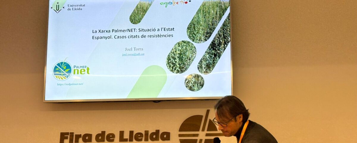 9 diciembre, 2025La Red de Investigación PalmerNET fue presentada el 26 de noviembre en la Jornada de Sanidad Vegetal organizada por la Generalitat de Catgalunya dentro del marco del Agrobiotech Innovation Forum, que tuvo lugar del 25 al 27 de noviembre en Lleida. Además de presentarse la red, sus objetivos y participantes, se actualizó la situación de Amaranthus palmeri en el estado español. Se explicaron a qué nuevas CCAA ha llegado la especie, y también el estado actual de los casos de resistencia a herbicidas en España.